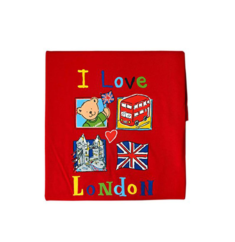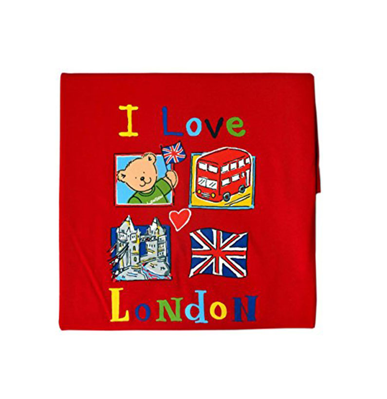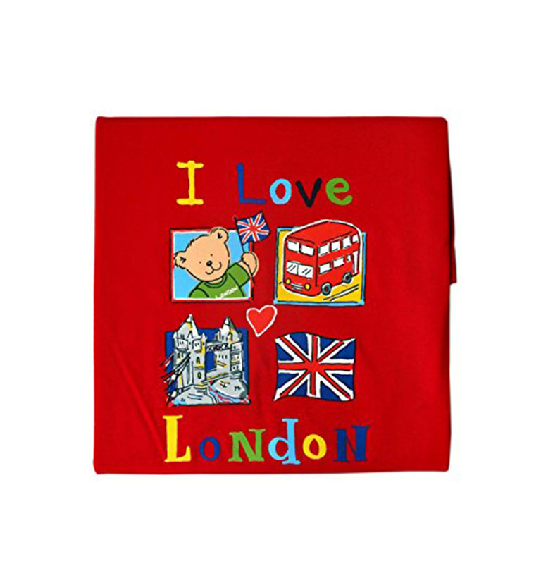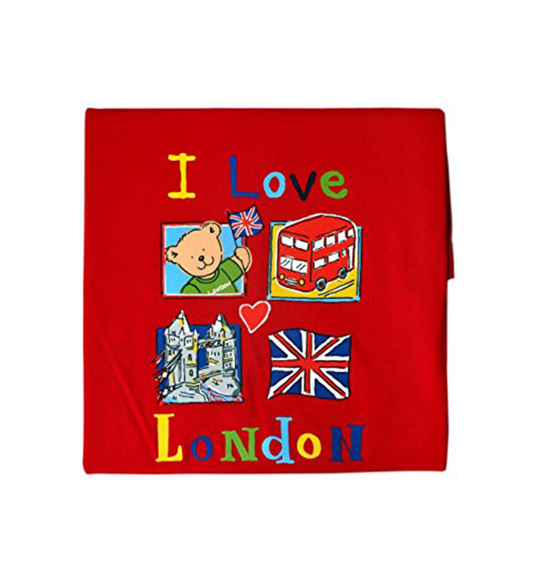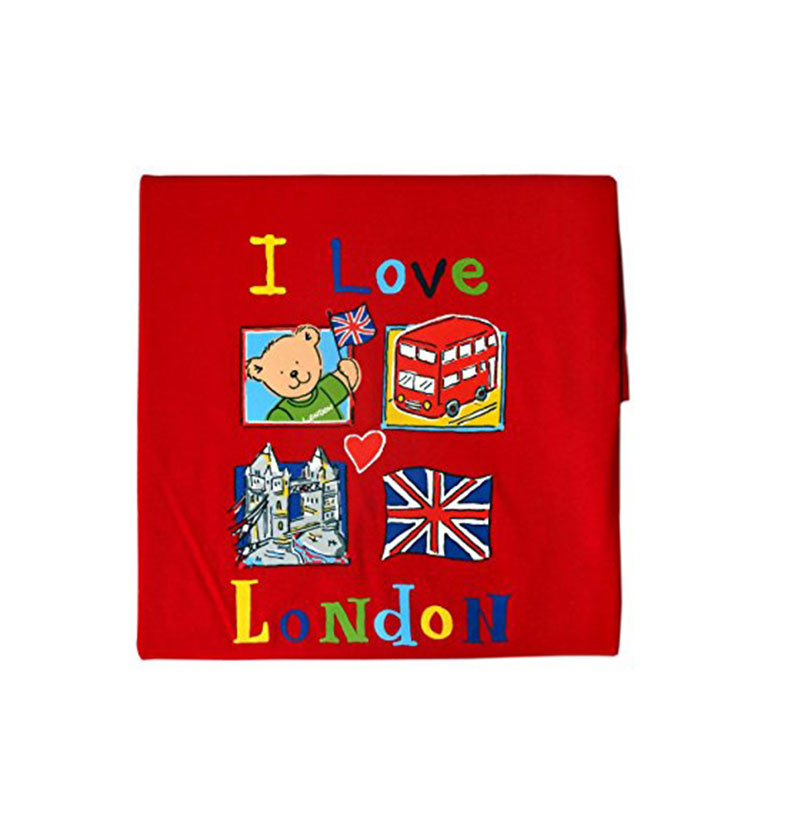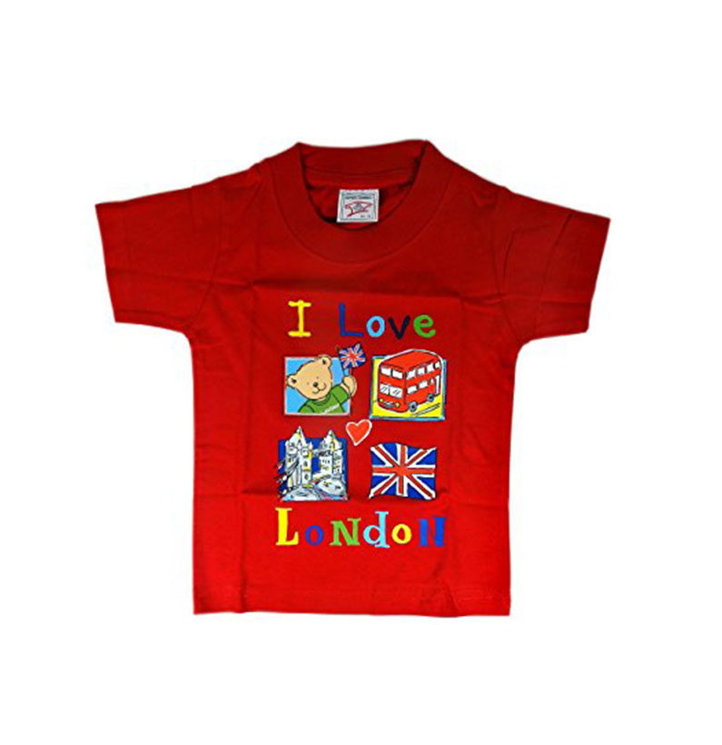 I Love London Design Children Tee Shirt detailing Teddy with Flag, London Red Bus, Tower Bridge and Union Jack Print. Red, 100% Cotton.These Kids T- Shirts are available in 5 different sizes, there are 1-2 Years, 3-4 Years, 5-6 Years, 7-8 Years and 9-10 Years. The same design also available in the baby sizes as another listing that is 3-6 Months and 6-12 Months.