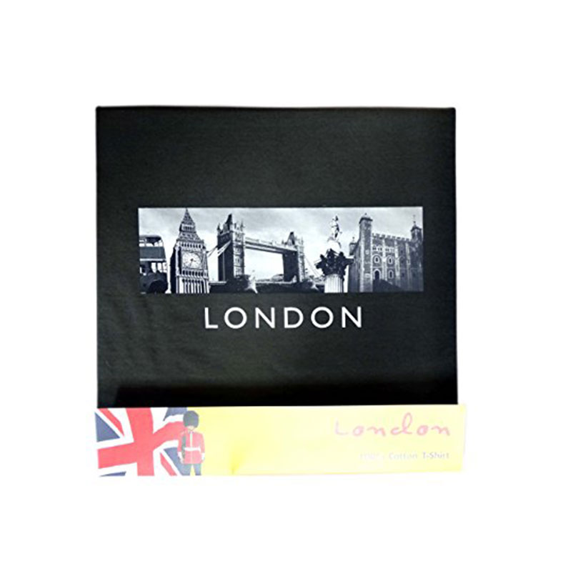 Premium Quality London Souvenir Printed T- Shirt with London Montage design detailing popular London landmarks including Big Ben, Tower Bridge, Nelson Column etc , Black, 100% Cotton. Comes in very nice package with printed back card. One of the best selling London Souvenir T-Shirt. Available sizes are Small, Medium, Large, Extra Large and Extra Extra Large.