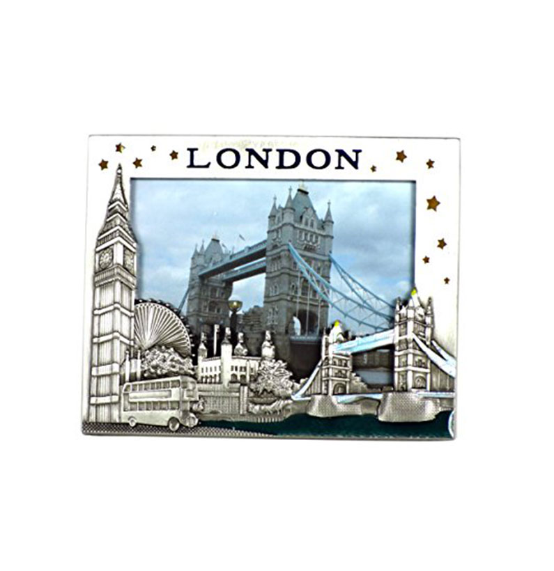 A Pewter Effect Metal London Souvenir Photo / Picture Frame detailing London Skyline including Big Ben, Bus and Tower Bridge (approx height 9.8 cm, width 12.0 cm). Beautifully made. One of the best selling London souvenirs Photo Frame. Come in a printed cardboard presentation box. Ideal gift for Friends and Family.