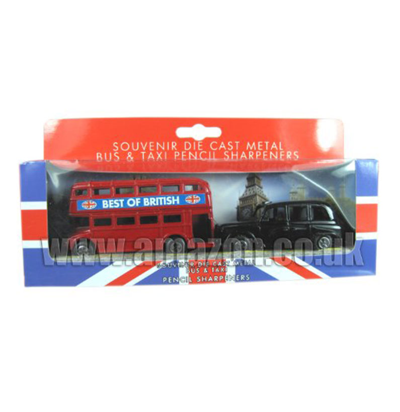 Bus and Taxi Pencil Sharpeners: A boxed set of London Die Cast Model Pencil Sharpeners. One of the best selling London Souvenir Pencil Sharpener Set. Beautifully made and painted. Value for Money. Come in a window box. Approximate Measurements: Bus: Base 8.5 cm x 2.5 cm Height 4.0 cm Taxi: Base 8.0 cm x 3.5 cm Height 3.0 cm