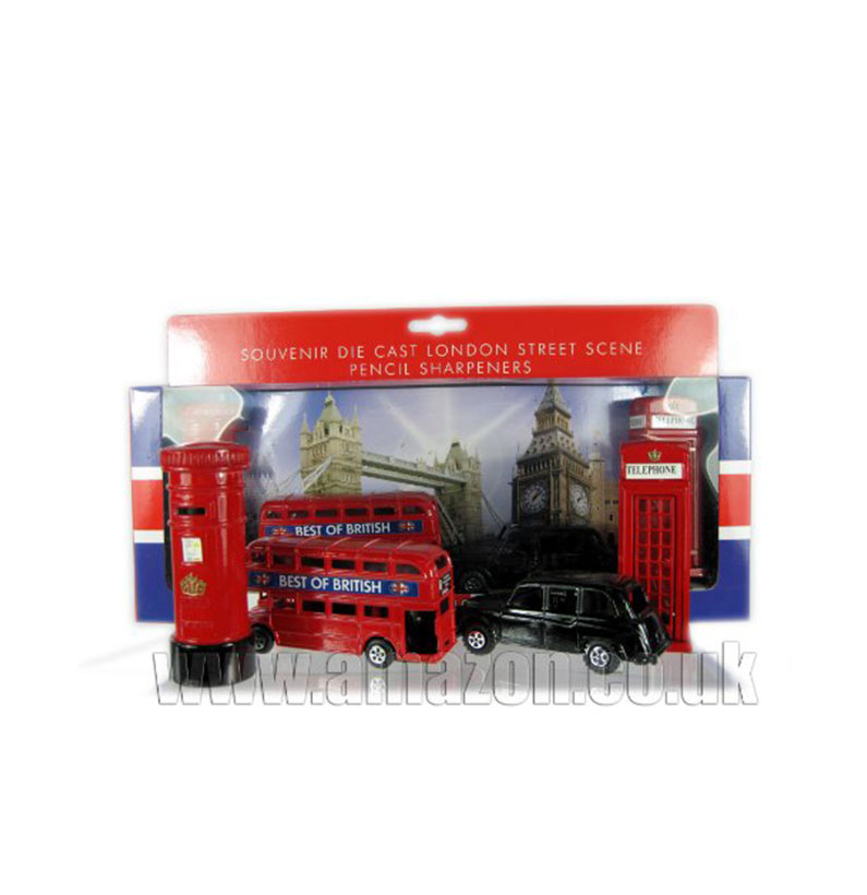 A London Die Cast Model Pencil Sharpener Set. One of the best selling London souvenir pencil sharpener set Beautifully made and painted. Value for Money. Come in a window box. Approximate Measurements: Bus: Base 8.5 cm x 2.5 cm Height 4.0 cm Taxi: Base 8.0 cm x 3.5 cm Height 3.0 cm Telephone Box: Base 3.2 cm x 3.2 cm Height 8.5 cm Post Box: Base 3.0 cm x 3.0 cm Height 8.5 cm