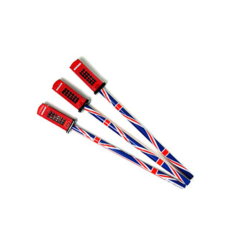 Pencils – Set of 3 Union Jack Pencils with London Red Telephone Box Toppers Made of Plastic