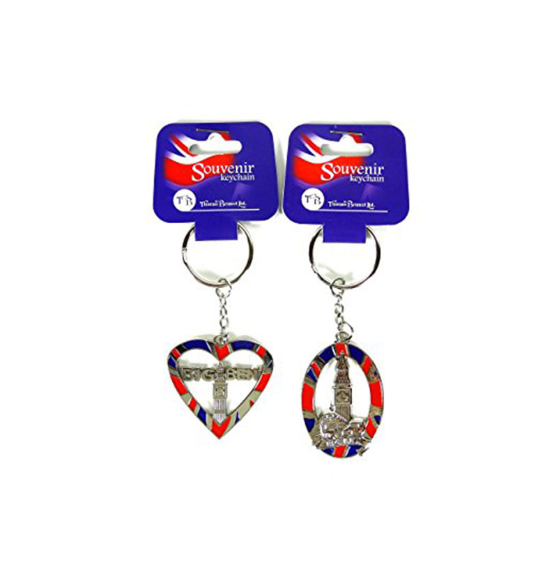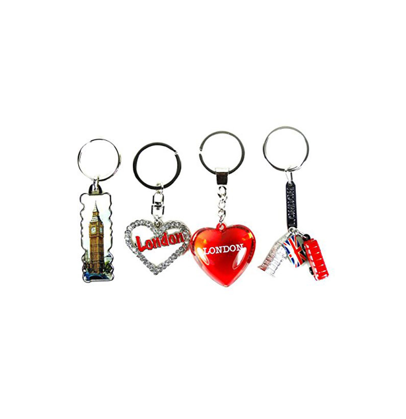 Set of four keyrings in a pack. Which include one of the London Multi Charms Keyring, One of the 3-D Red Heart Keyring, one of the Diamante Heart keyring and One of the Big Ben Keyring. Best selling London Souvenir Keyring Set.