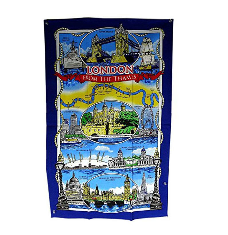 A tea towel with the print of London from the Thames with famous landmarks such as Houses of Parliament, London Eye, Tower Bridge etc. This tea towel is made of 100% cotton. Ideal gifts for friends and family and a great souvenir of London. Material: 100% Cotton Approximate Size: 75 cm x 47 cm (30 inch x 18 inch)