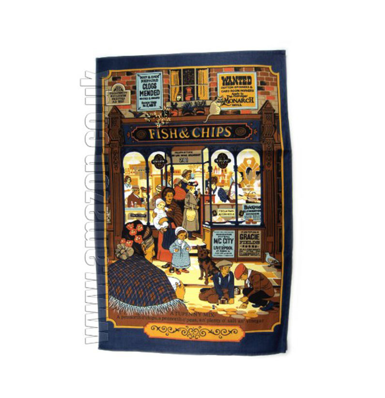 London Fish & Chips Shop printed Tea Towel. It's say " A TUPENNY MIX - A pennorth o' chips, a pennorth o' peas, an plenty o' salt an' vinegar". These tea towels are made of 100% cotton. Ideal gifts for friends and family and a great souvenir of London. Material: 100% Cotton Approximate Size: 72 cm x 44 cm