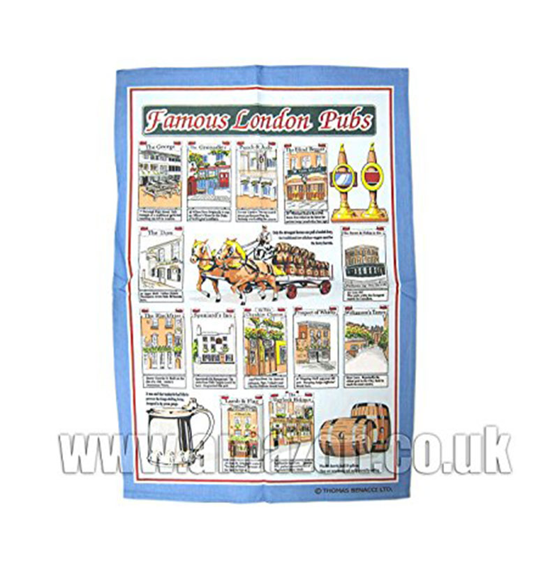 Famous London Pubs printed Tea Towel. It details 13 London Pubs including the Sherlock Holmes, The George and The Blackfriar. Also it give details about their location too. These tea towels are made of 100% cotton. Ideal gifts for friends and family and a great souvenir of London. Material: 100% Cotton Approximate Size: 74 cm x 50 cm