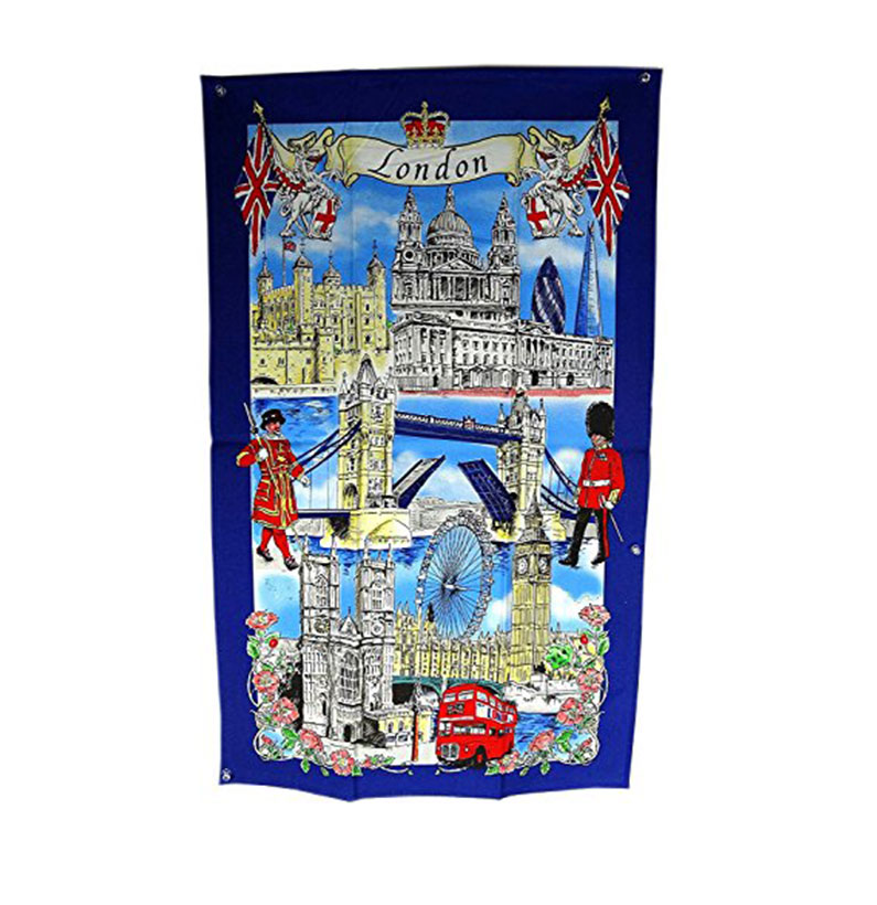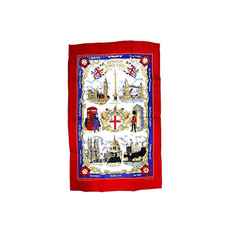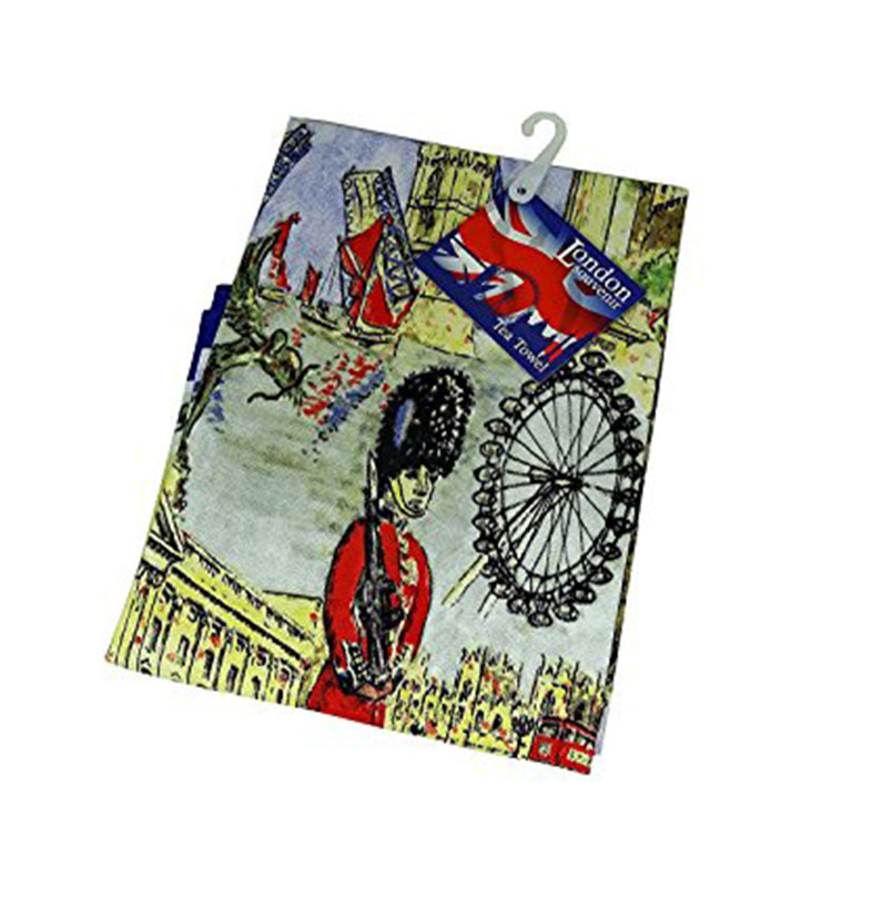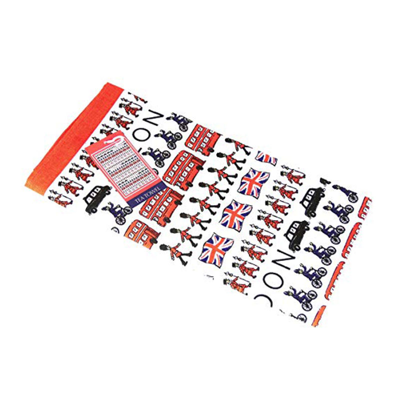 A tea towel with the print of London Classic, detailing popular London icons including the big red bus, palace guards, beefeater and famous landmarks . This tea towel is made of 100% cotton. Ideal gifts for friends and family and a great souvenir of London. Material: 100% Cotton Approximate Size: 75 cm x 47 cm (30 inch x 18 inch)