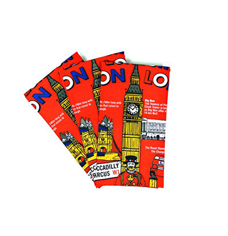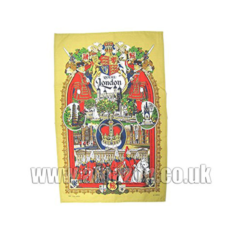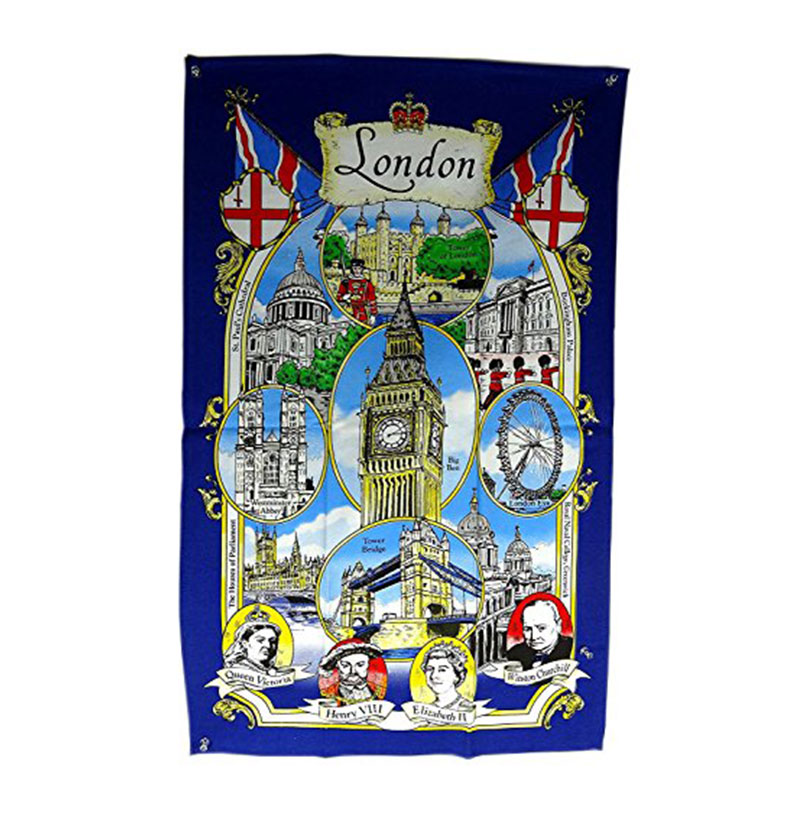 A tea towel with the print of London Big Ben and landmarks with famous people faces such as Queen Victoria, Henry the VIII, Elizabeth II and Winston Churchill. This tea towel is made of 100% cotton. Ideal gifts for friends and family and a great souvenir of London. Material: 100% Cotton Approximate Size: 75 cm x 47 cm (30 inch x 18 inch)