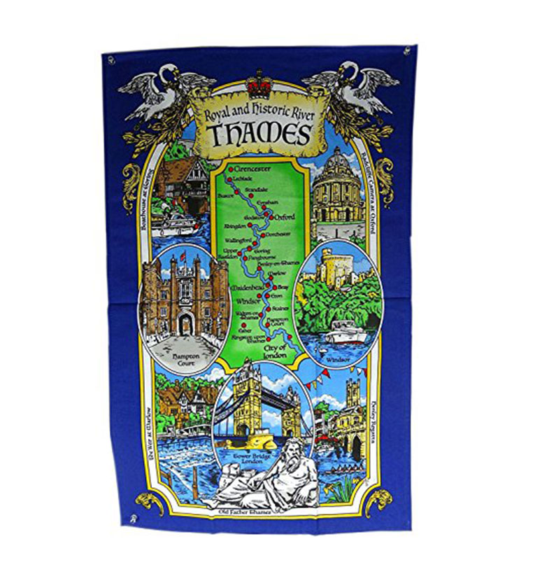 A tea towel with the print of Royal and Historic River Thames, detailing iconic landmarks including Boathouse, Radcliffe Camera, The Weir, Henley Regatta and Old Father Thames. This tea towel is made of 100% cotton. Ideal gifts for friends and family and a great souvenir of London. Material: 100% Cotton Approximate Size: 75 cm x 47 cm (30 inch x 18 inch)