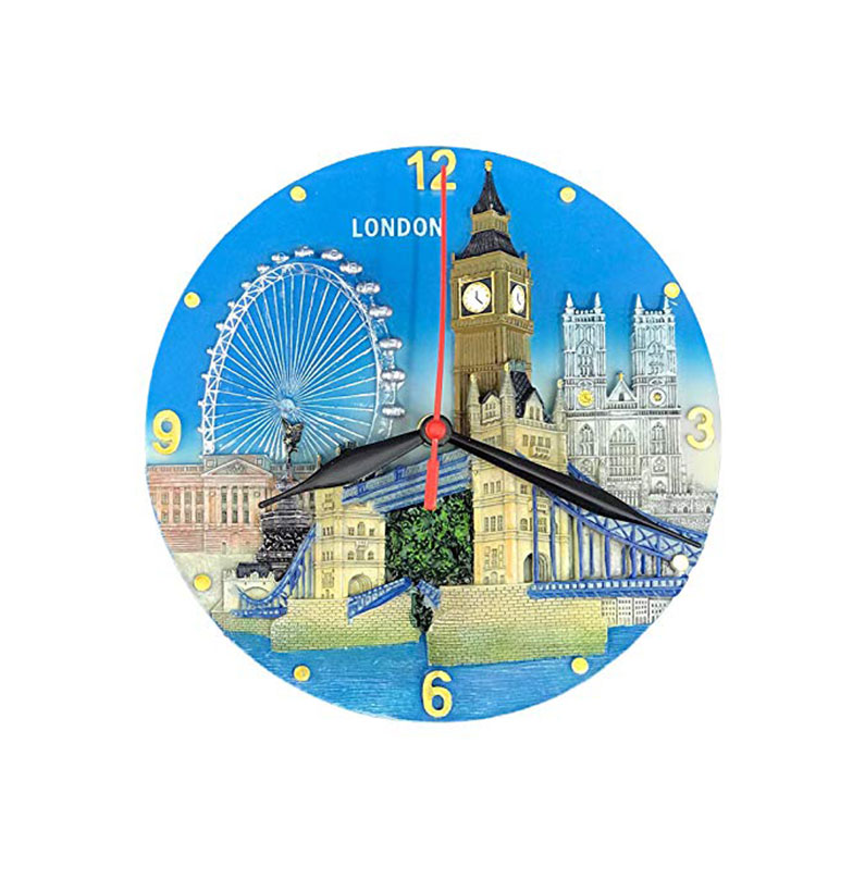 A London Souvenir Clock (approximate diameter 19.0cm). Beautifully made. One of the best selling London souvenir wall clock. Comes in a printed cardboard presentation box. Ideal gift for friends and family.