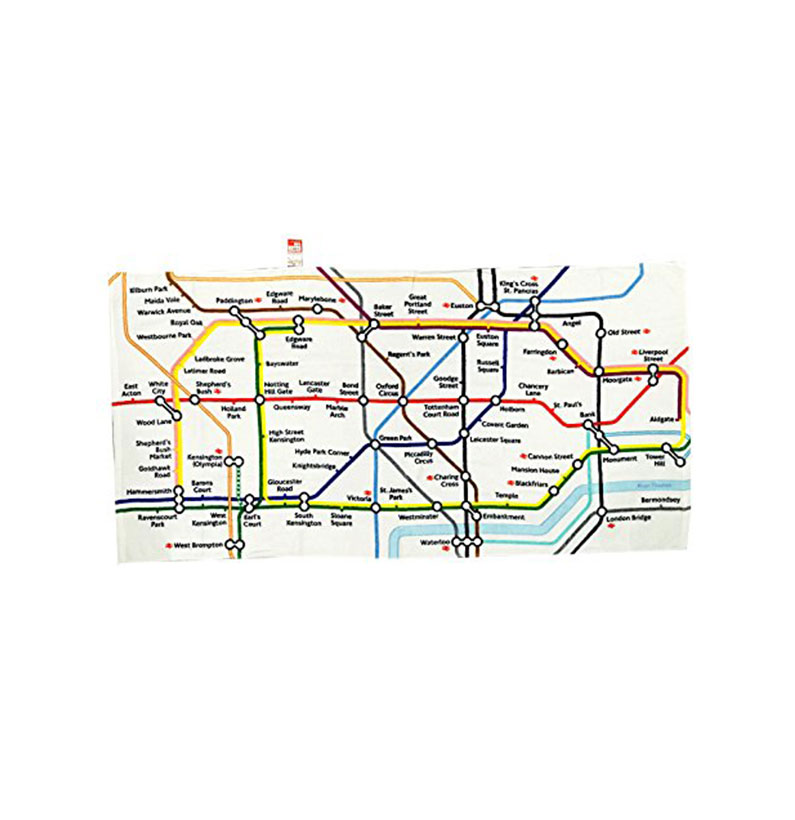 London Underground Tube Map printed cotton Beach Towel, made of 100% cotton. One of the best Transports for London souvenir beach towel. Ideal gift for friends and family. Approximate Measurement: Length: 150 cm, Width: 67 cm