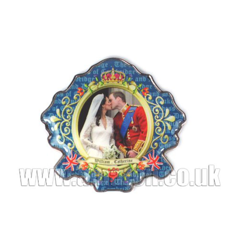 Metal Shaped (Cut-out) Fridge Magnet of H R H Prince William and Catherine. One of the Best Selling Royal Wedding Souvenir. Approx Measurements: Max Length 48mm, Max Height 43 mm