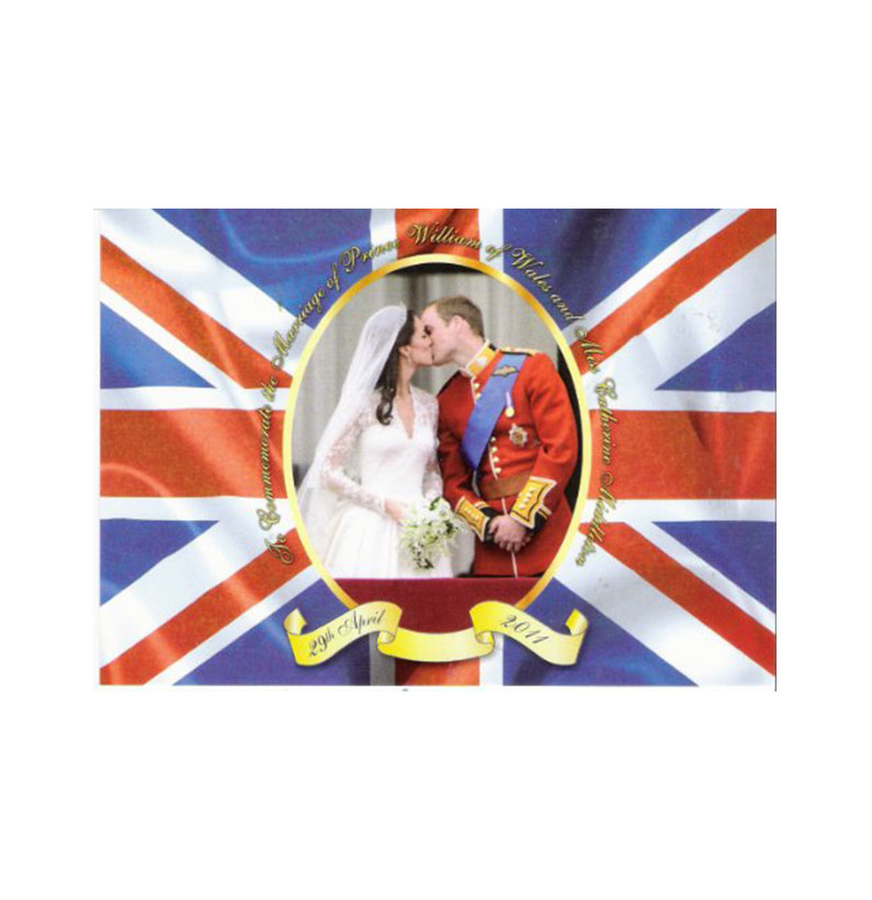 A printed postcard of T R H The Duck and Duchess of Cambridge with the Union Jack Background To commemorate the Marriage of H R H Prince Willaim to Miss Catherine Middleton on the 29th April 2011 at Westminster Abbey. The Royal Couple Kissing in the Buckingham Place Balcony just after their Marriage. With Union Jack Background.